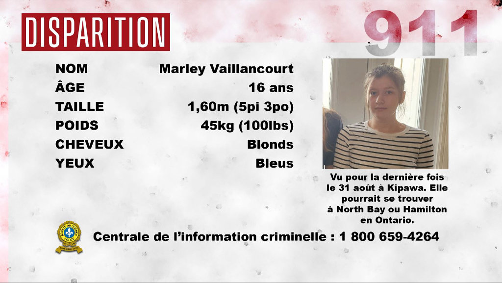 La Sûreté du Québec demande l’aide du public pour retrouver Marley Vaillancourt, une adolescente de 16 ans, de Kipawa.